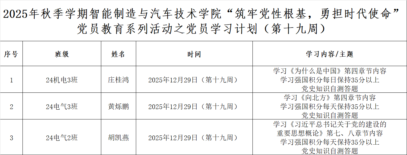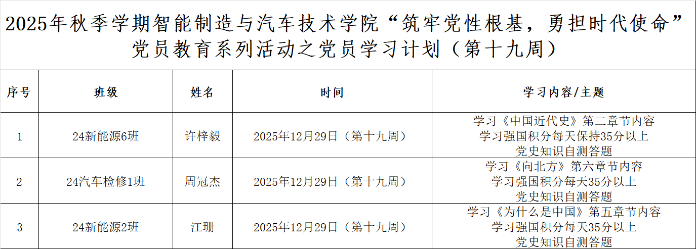 为深化党员的自我教育管理模式,切实提升党员自我教育管理实效,智能制造与汽车技术学院党总支针对现阶段党员教育管理不足现状,积极探索,组织开展党员自我教育学习活动,锚定学习目标,认真贯彻落实,狠抓推进整改,抓好奖励惩罚。现将第十九周党员学习计划及检查结果公布如下: