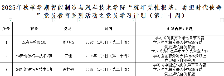 为深化党员的自我教育管理模式,切实提升党员自我教育管理实效,智能制造与汽车技术学院党总支针对现阶段党员教育管理不足现状,积极探索,组织开展党员自我教育学习活动,锚定学习目标,认真贯彻落实,狠抓推进整改,抓好奖励惩罚。现将第二十周党员学习计划及检查结果公布如下: