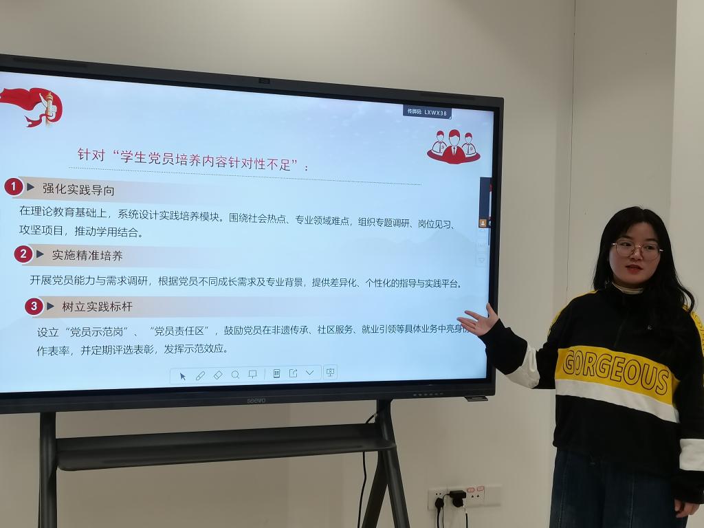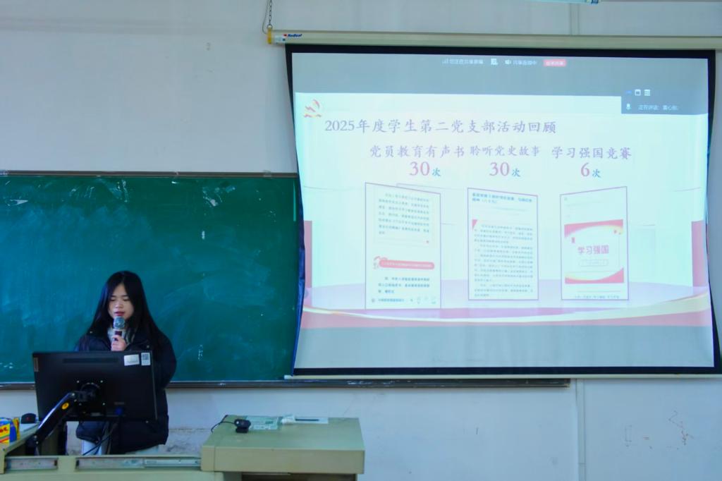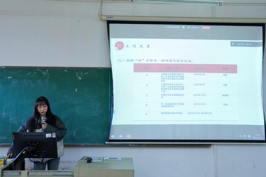 接着,学生第三党支部书记陈雅静同志进行述职汇报。她介绍了支部在理论学习深化、实践活动开展、党员队伍建设等方面的具体举措与阶段性成果。同时,她也指出支部在学生党员培养内容针对性方面仍存在短板,后续将持续优化培养模式,深化理论与实践融合,提升党员培养工作的适配性与实效性。