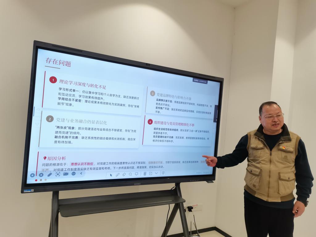 最后,教师党支部书记吴刚同志进行述职汇报。他立足自身岗位履职尽责,在完成支部日常党建工作与学院党建活动任务的同时,持续强化自身党员意识与理论素养,查摆支部工作中存在的短板与不足,提出针对性改进举措并明确后续工作方向。