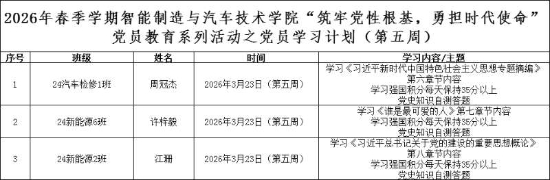 为深化党员的自我教育管理模式,切实提升党员自我教育管理实效,智能制造与汽车技术学院党总支针对现阶段党员教育管理不足现状,积极探索,组织开展党员自我教育学习活动,锚定学习目标,认真贯彻落实,狠抓推进整改,抓好奖励惩罚。现将第五周党员学习计划及检查结果公布如下: