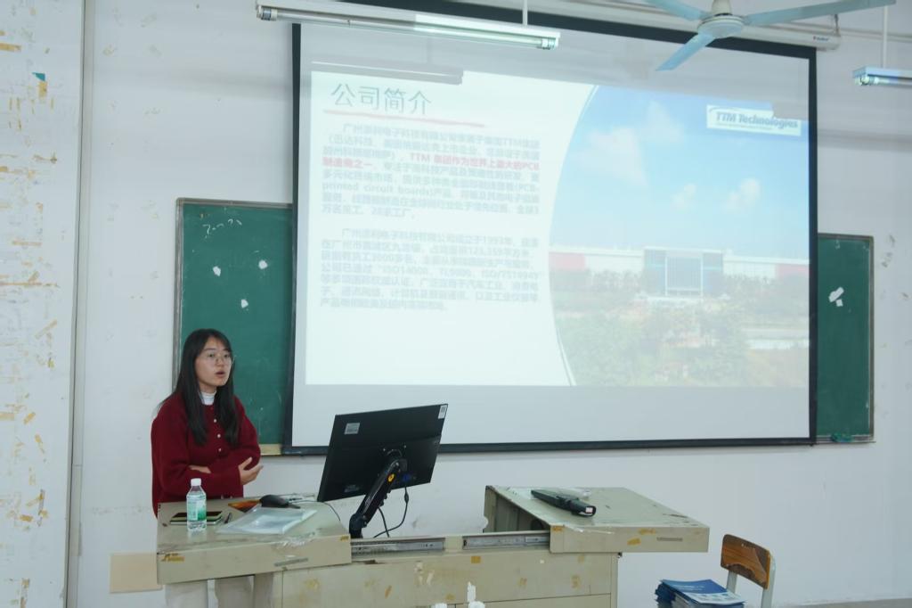 宣讲会伊始,添利企业代表为同学们详细介绍了公司的发展历程和行业地位,广州添利隶属于美国TTM集团(迅达科技),作为美国纳斯达克上市企业,TTM集团是全球十大PCB制造商之一,在航空航天、汽车、医疗等领域稳居技术领先地位,全球布局28家工厂,拥有3万名员工及109项技术专利。公司成立于1993年,坐落于广州市黄埔区九龙镇,产品畅销欧美及国内高端市场,应用于汽车工业、消费电子、通讯网络等多个核心领域。