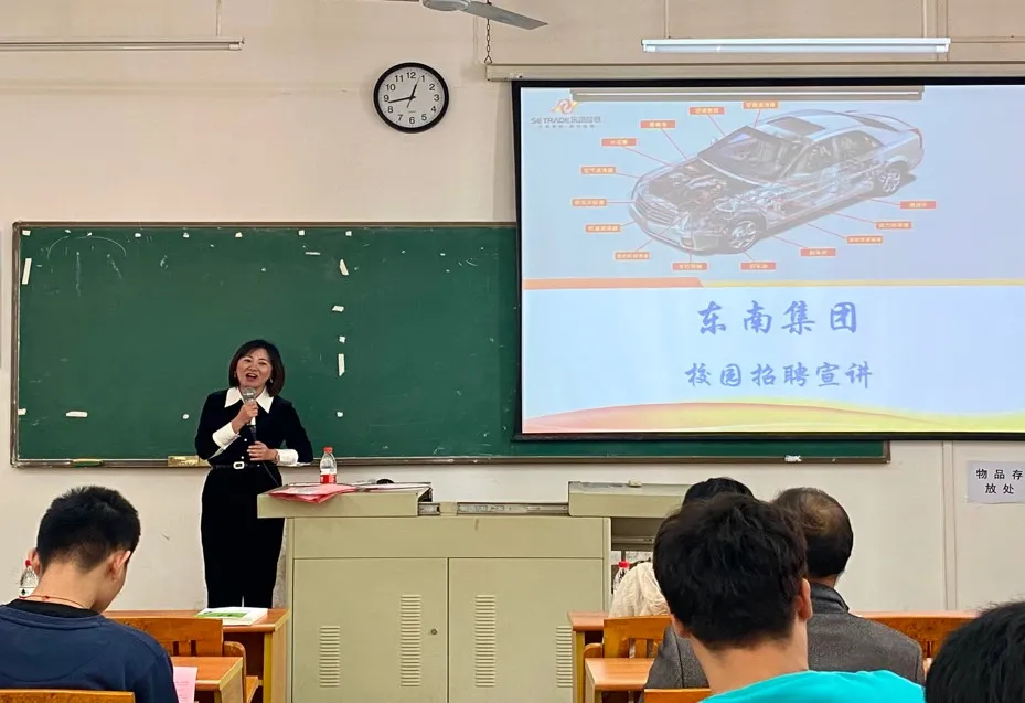2021年11月16日中午12:40分,智能工程学院与东莞市东南贸易有限公司在博B302召开宣讲会,参会的领导嘉宾有:东南集团执行董事陈展女士、总经理钟洪章先生、人事部主任吴燕女士、智能工程学院吴刚教授、戴乐毅老师,及19级汽车专业学子。