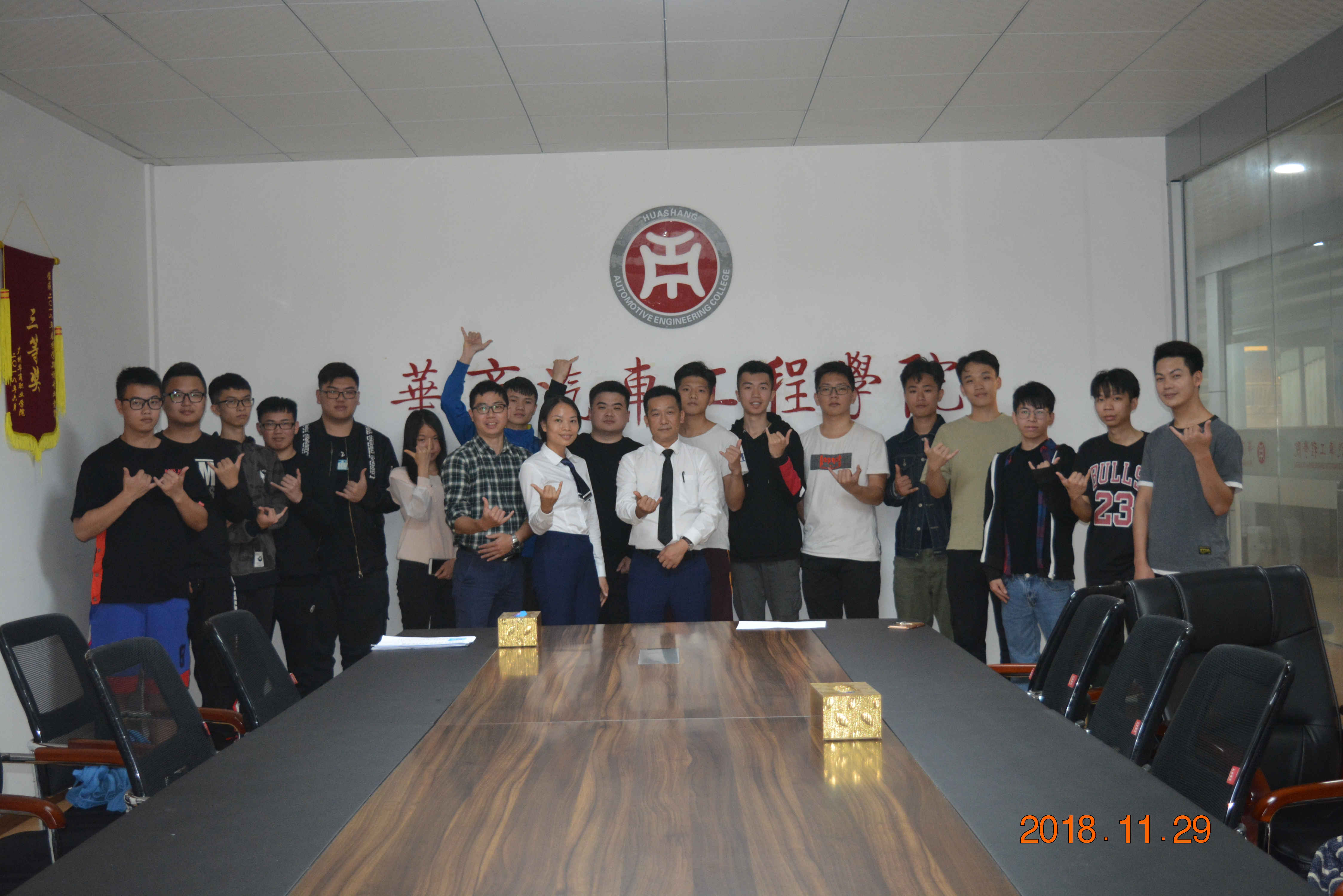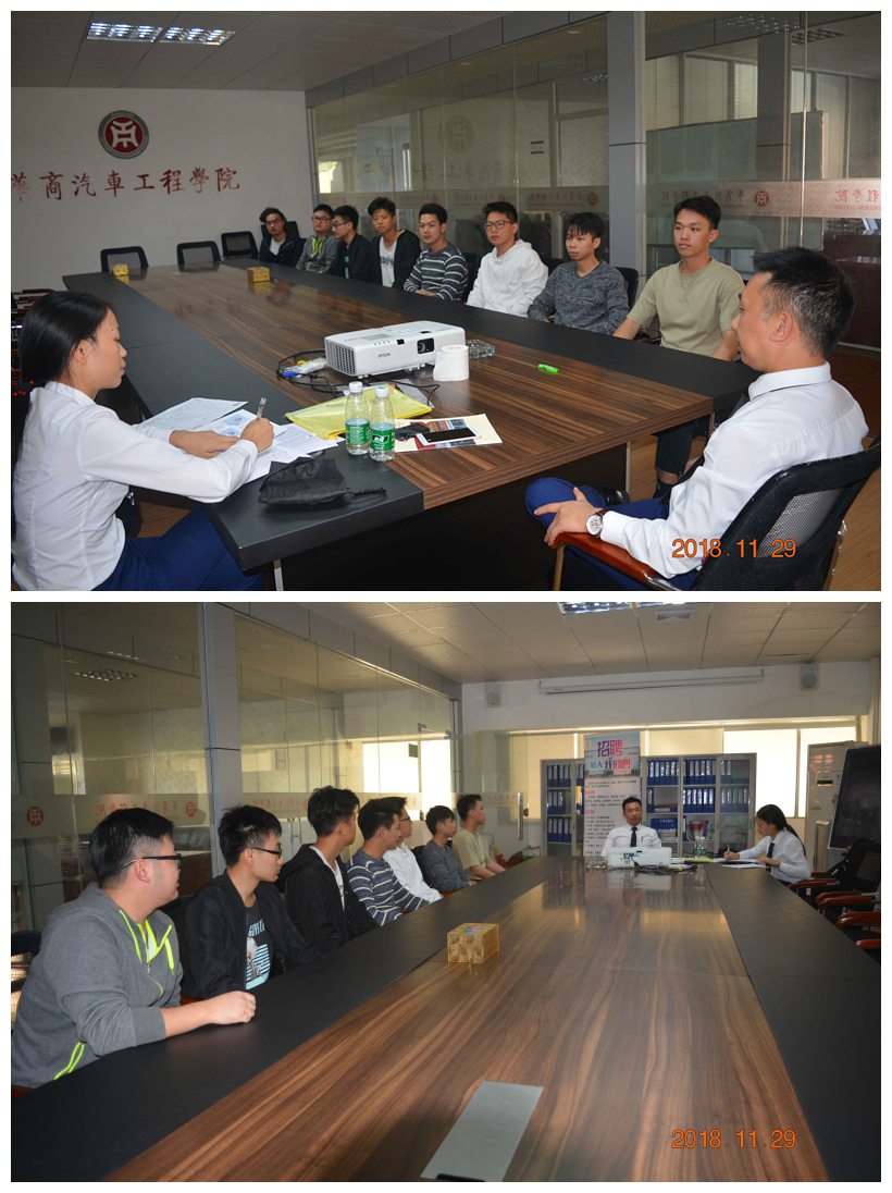 2018年11月29日下午14:30,广州为众汽车集团公司培训部林经理、黄主管,另外三家分店的销售部经理、售后部经理等一行7人,应邀来到汽车工程学院校区,洽谈校企合作事宜暨16级汽车学生顶岗实习的面试沟通。