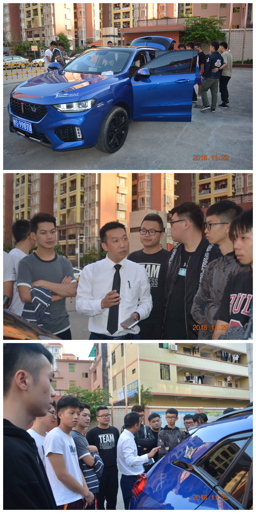 为众汽车集团东莞分公司的黄经理还晓有兴致地把同学们带到他们的全新试驾车委派SUV现场“教学与展示”,个别同学还坐到车内体验一下该车的司乘感受。