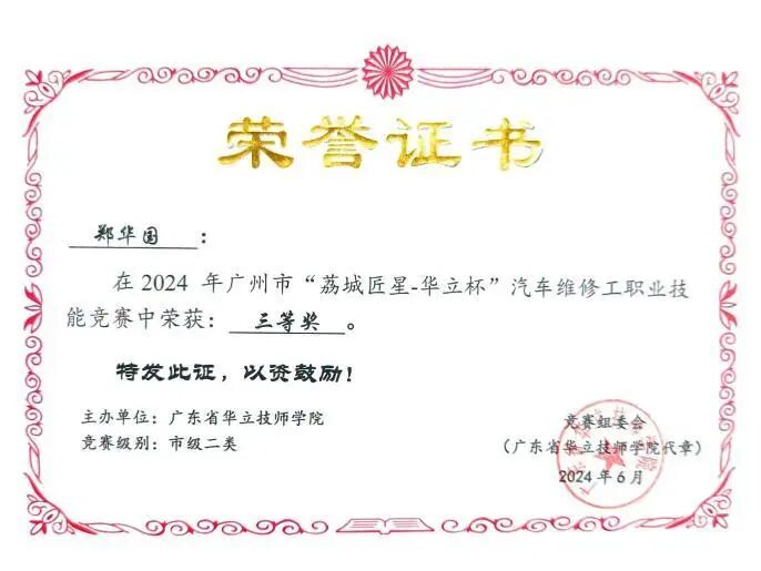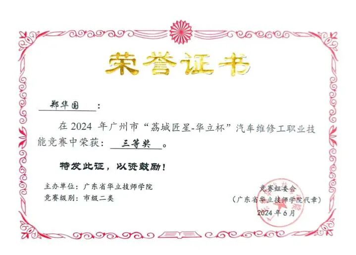 2.2024年广州市汽车维修工职业技能竞赛三等奖;