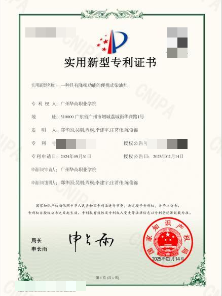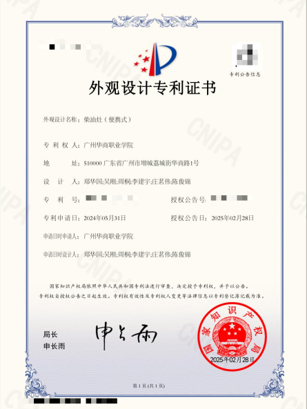 科研实践方面,作为项目负责人主持2023年校级大创训练项目《车载户外便携式柴油灶制作与销售》,于2024年6月完成结项。项目推进过程中以第一发明人身份获两项授权专利,包括“一种具有降噪功能的便携式柴油灶”实用新型专利及便携式柴油灶外观设计专利。