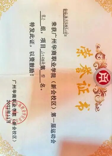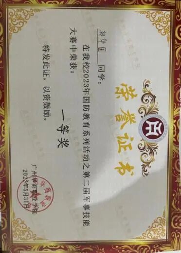 5.广州华商职业学院第二届军事技能大赛一等奖、2023年“应急进校园”全国大学生心理健康专题竞赛一等奖;