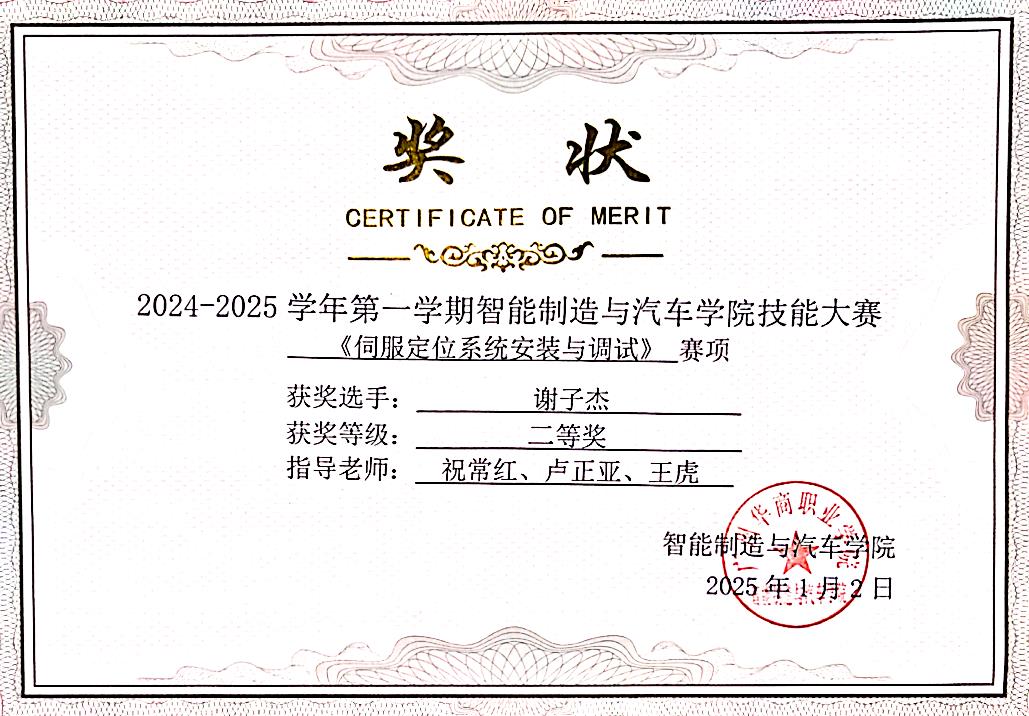 6.【院级】2024-2025 学年度智能制造与汽车学院智能控制教研室学生技能竞赛《伺服定位系统的安装与调试》二等奖;