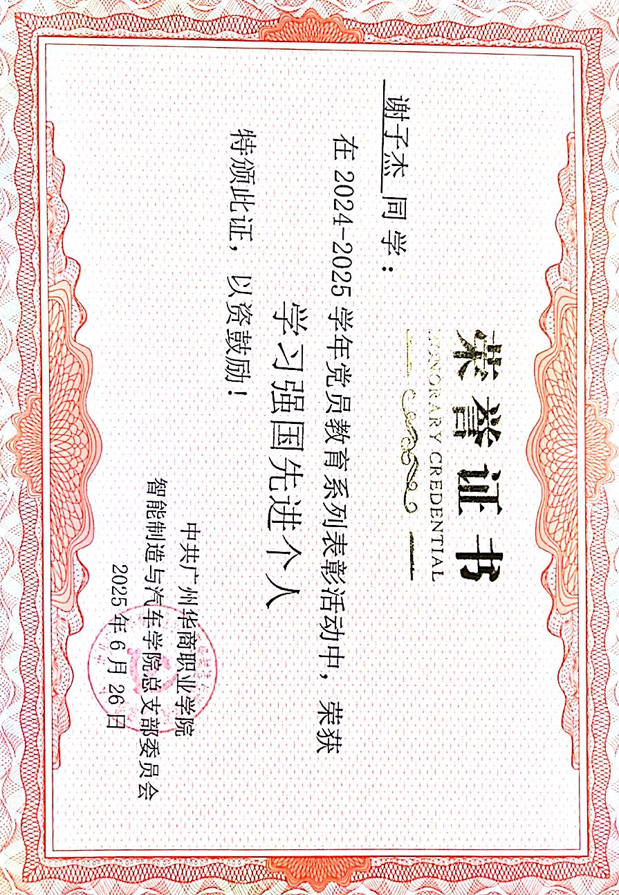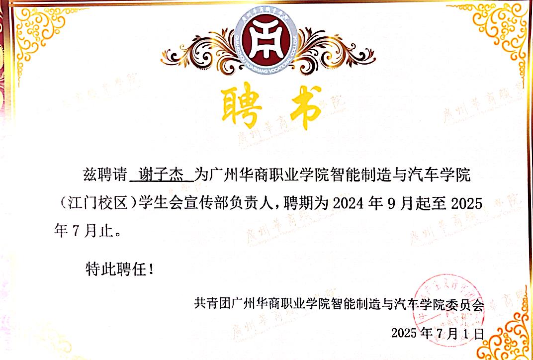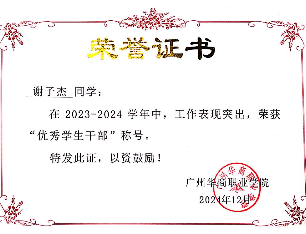 谢子杰,广州华商职业学院智能制造与汽车技术学院电气自动化技术专业2023 级学生,汉族,中共预备党员,专业成绩稳居前列。在校期间身兼班级班长、学院宣传部干部、机电创新社社长、校友联络员多职,勤奋钻研学业、勇担学生责任、热心志愿服务,用多元成长诠释青年担当。所获得的荣誉奖项有: