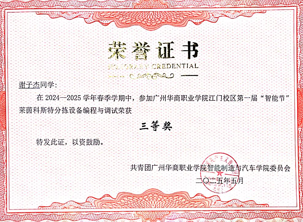 13.【院级】2024-2025 学年度广州华商职业学院智能制造与汽车学院第一届 “智能节” 之《莱因科斯特分拣设备与调试竞赛》三等奖;
