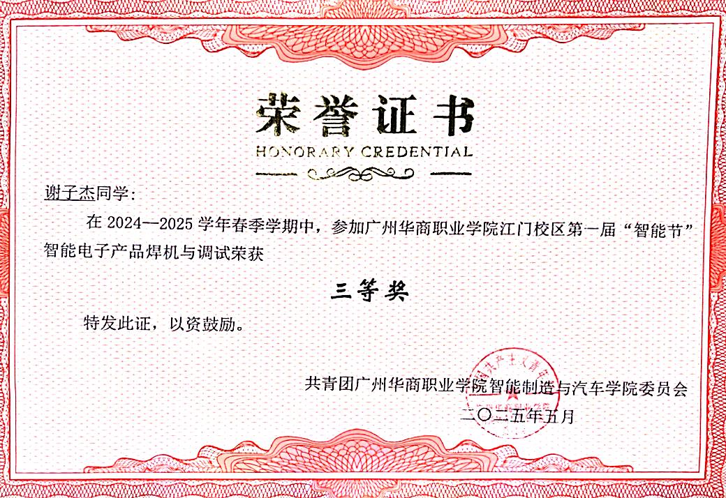 14.【院级】2024-2025 学年度广州华商职业学院智能制造与汽车学院第一届 “智能节” 之《智能电子产品焊接》三等奖。