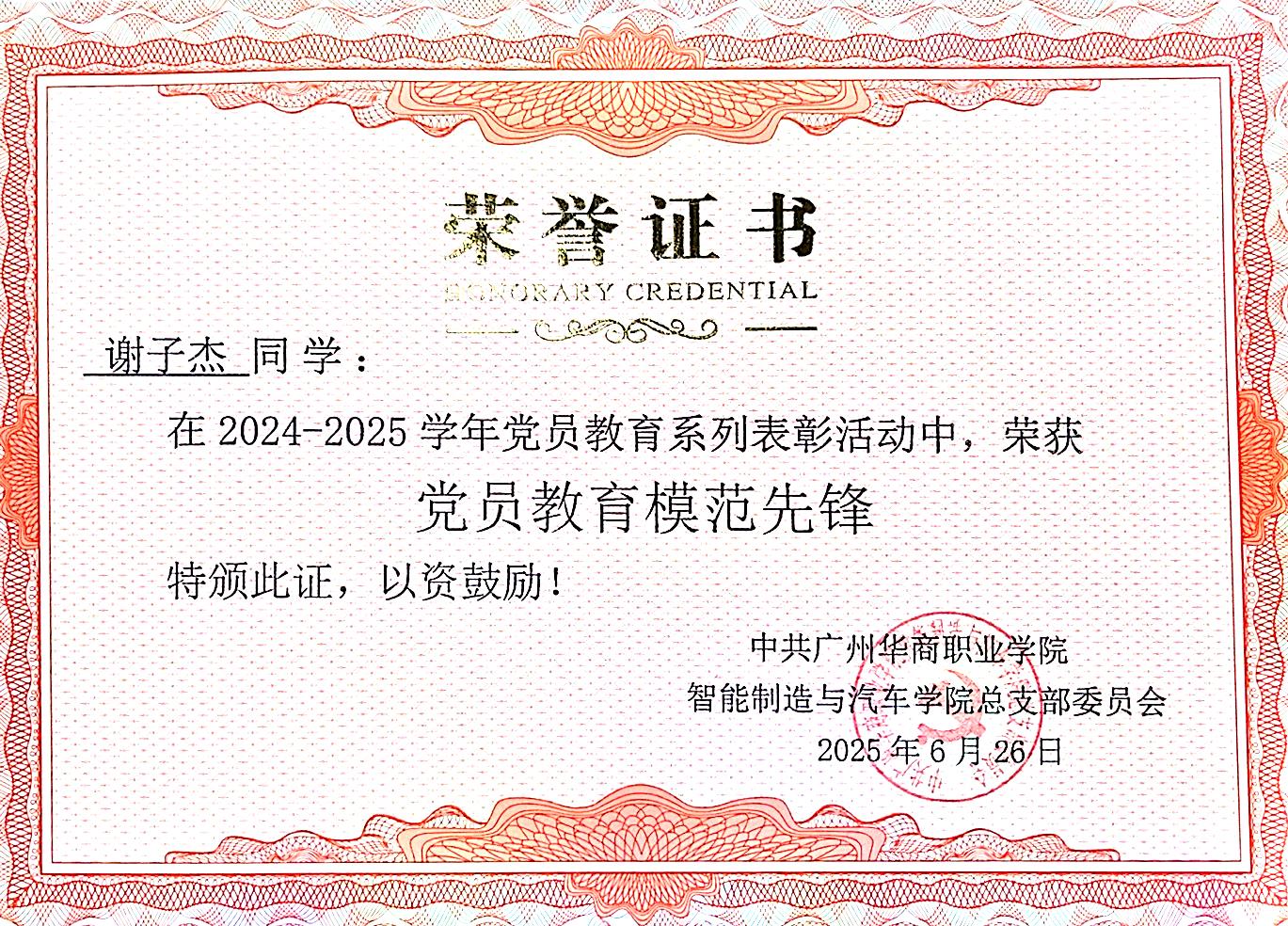 10.【院级】2024-2025 学年度党员教育系列表彰 “党员教育模范先锋”;