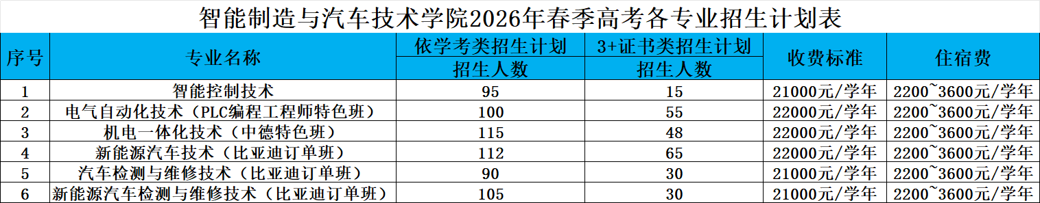 智能制造与汽车技术学院2026年春季高考各专业招生计划